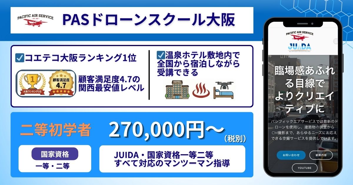 | PASドローンスクール大阪 | 一等・二等 | 【二等初学者】 270,000円(税別)〜 | 池田市(伏尾温泉内) |