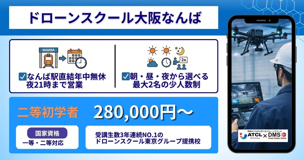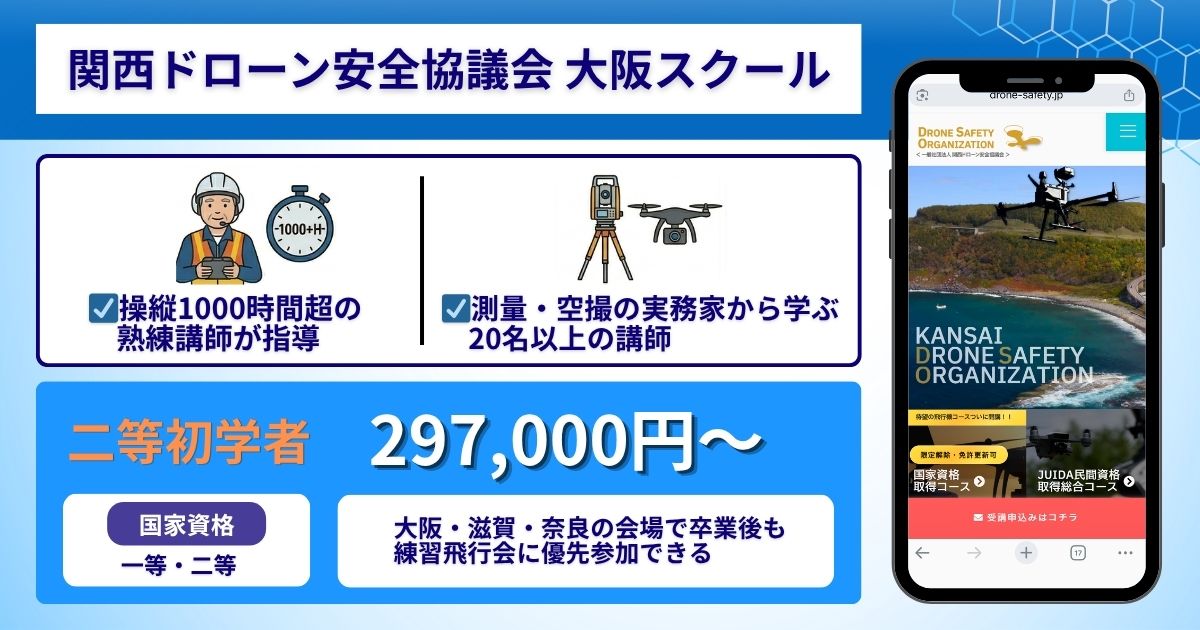 | ドローンマスターズスクール(DSJ) | 一等・二等 | 【二等初学者】 370,700円〜 | 梅田・難波・十三・淀屋橋・天満橋 |