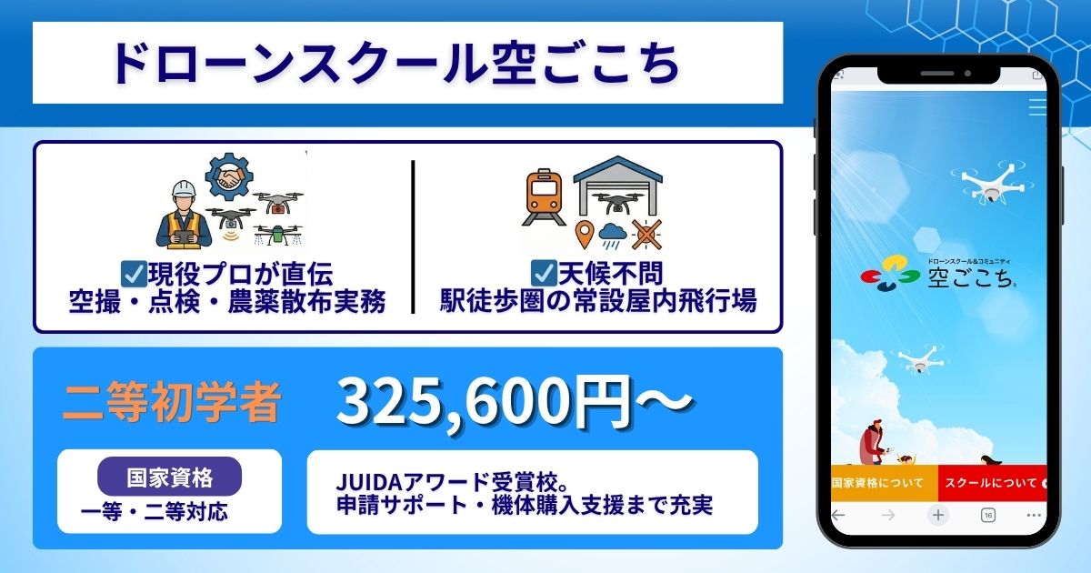 | ドローンスクール空ごこち | 一等・二等 | 【二等初学者】 325,600円 期間限定価格:292,600円 | 住之江区 |