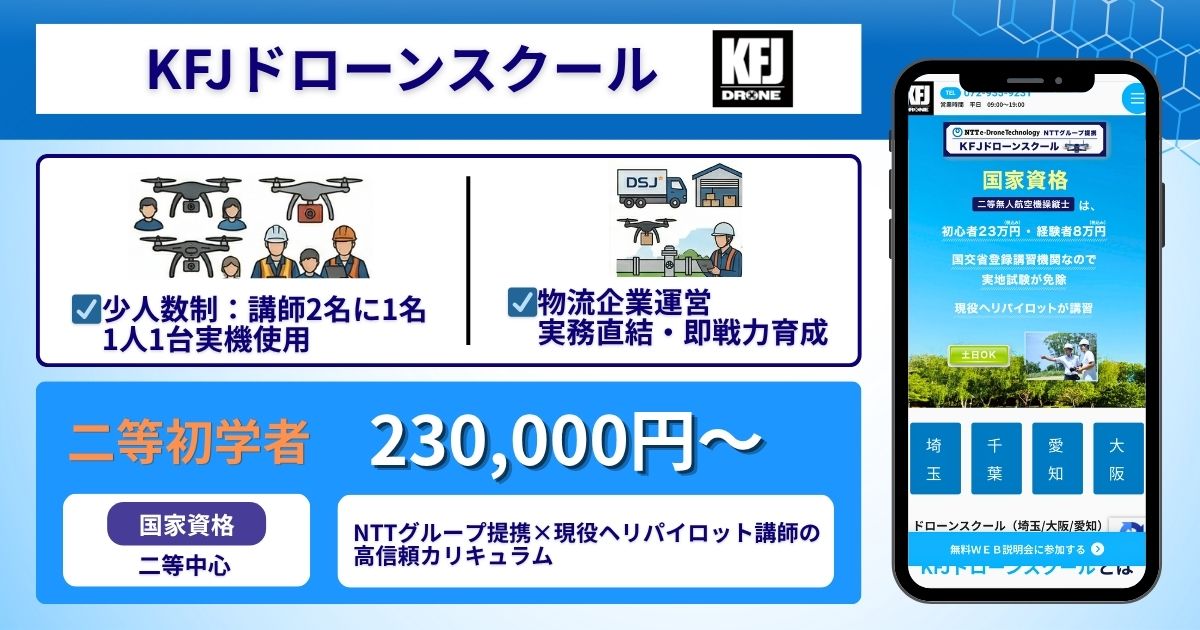 | KFJドローンスクール | 二等中心 | 【二等初学者】 230,000円〜 | 枚方・生野・貝塚 |